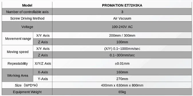 The PROMATION ET72H3KA Automatic Screw Driving Robot features a robust 3-Axis Robot Gantry with industry leading stability and accuracy. Complete with Input / Output Terminals, the system is integrated with a high-precision automatic screw driving system - designed to deliver constant torque through-out the assembly process.