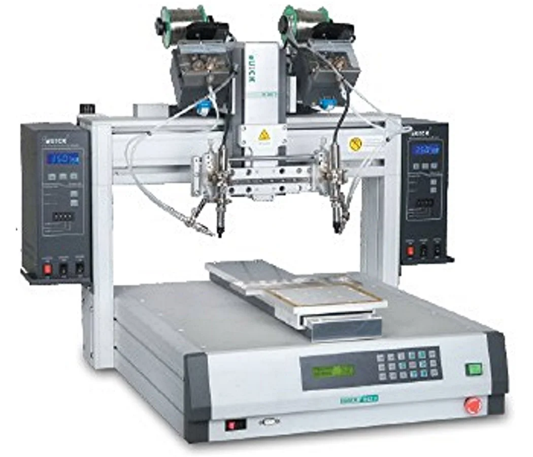 The QUICK 9433D Soldering Robot features a robust Hot Iron system with a superior closed loop temperature sensor capable of delivering and maintaining a tip temperature with industry leading stability and accuracy. A Dual-Tip system will grant increased production efficiency by doubling the volume of product being soldered in a single cycle. This system is ideal for Multi-up Panels with properly sequenced solder joints.